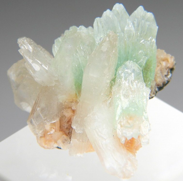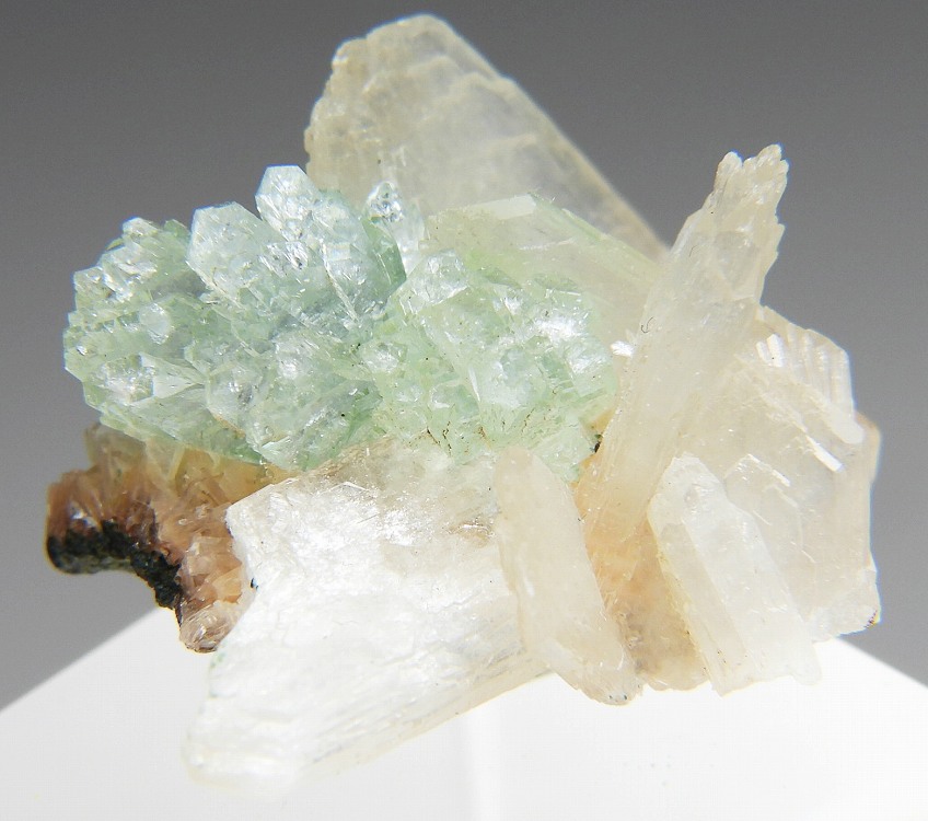 輝沸石と束沸石に共生した放射状の美しいグリーン魚眼石の結晶群です。