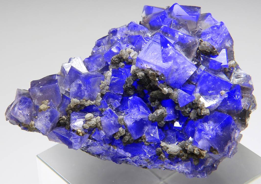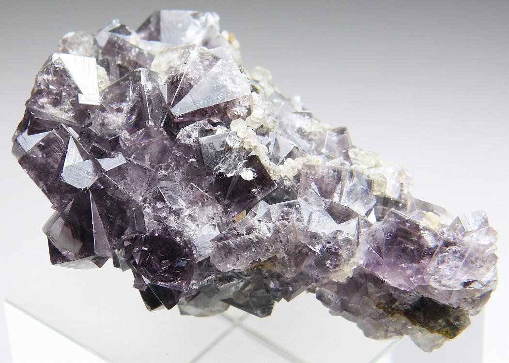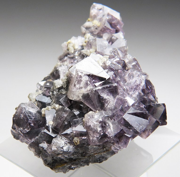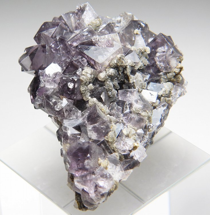 往年のフレーザーズ・ハッシュ鉱山で産したフローライト。透明度の高いライトパープルの美しい結晶群です。紫外線長波で明るく蛍光します。