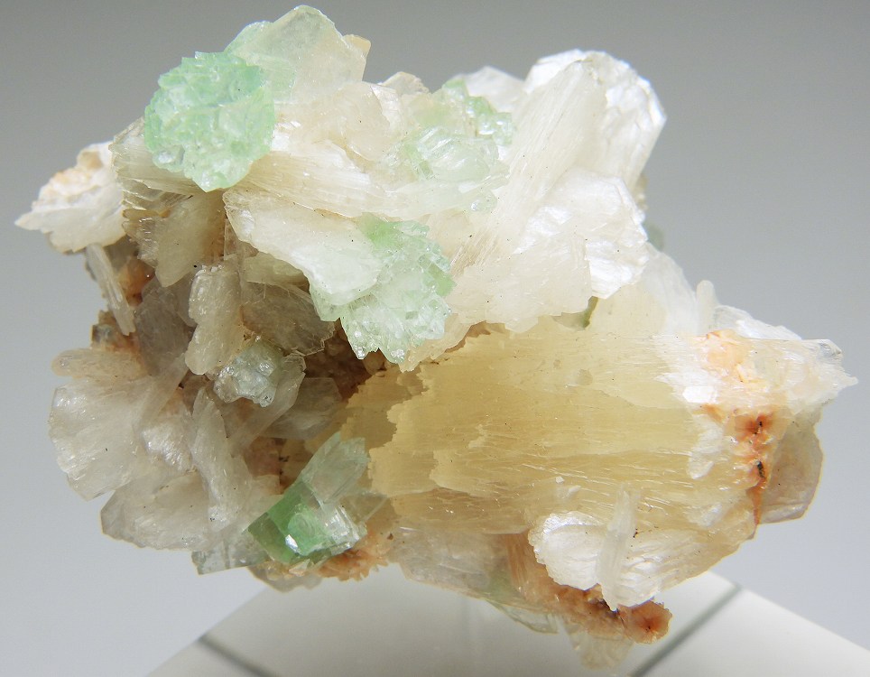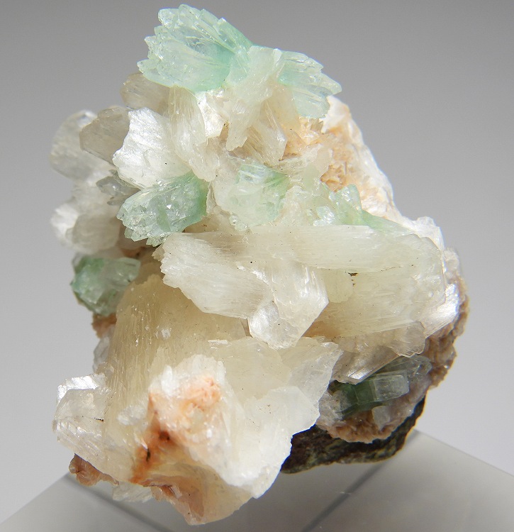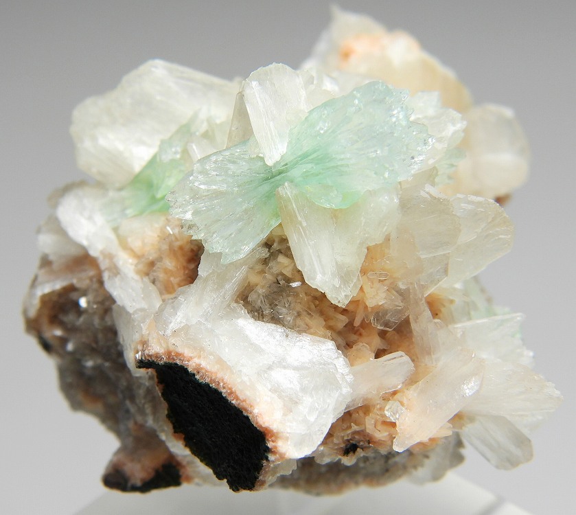 輝沸石と束沸石に共生した放射状の美しいグリーン魚眼石の結晶群です。