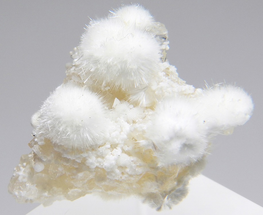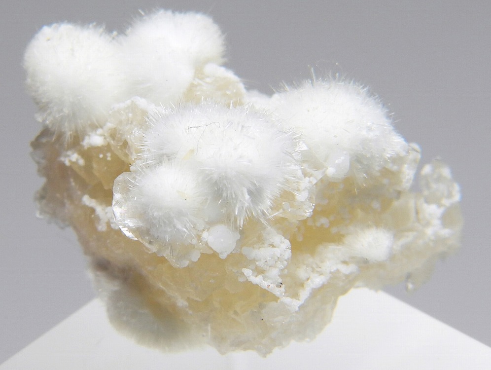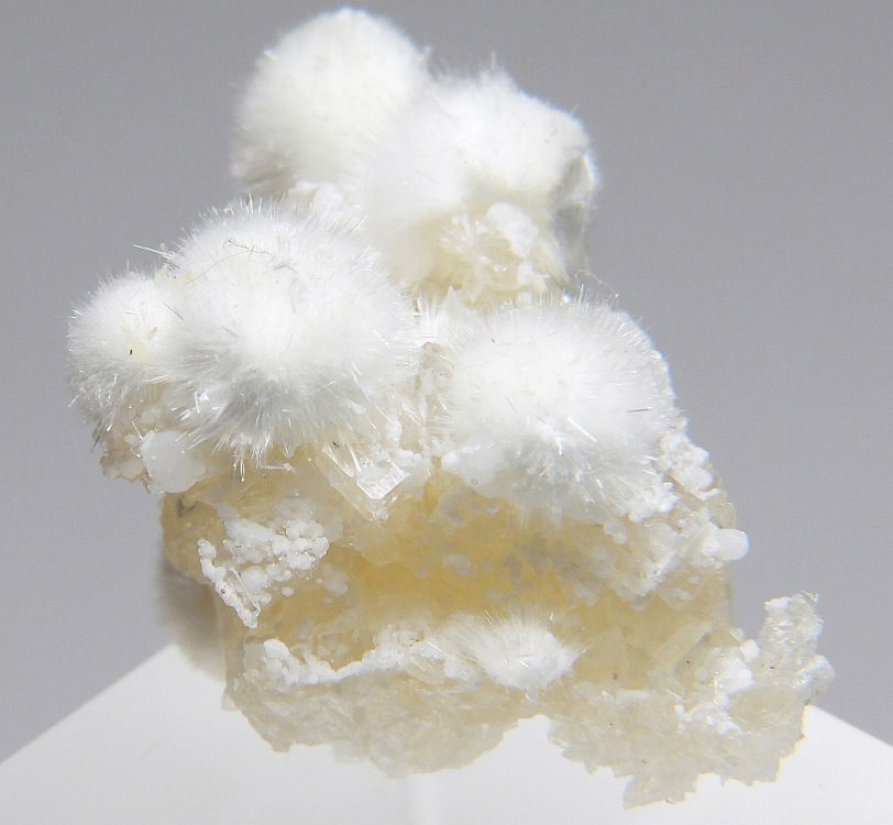 ぶどう石上に成長したオーケン石の結晶群。魚眼石とギロル石が共生します。