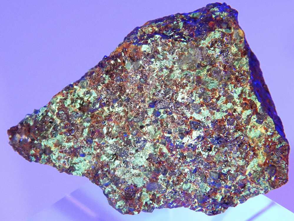 フランクリン鉄鉱と共生した紅亜鉛鉱です。珪亜鉛鉱部分が紫外線長波で蛍光します。