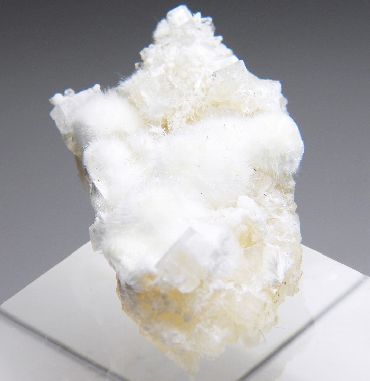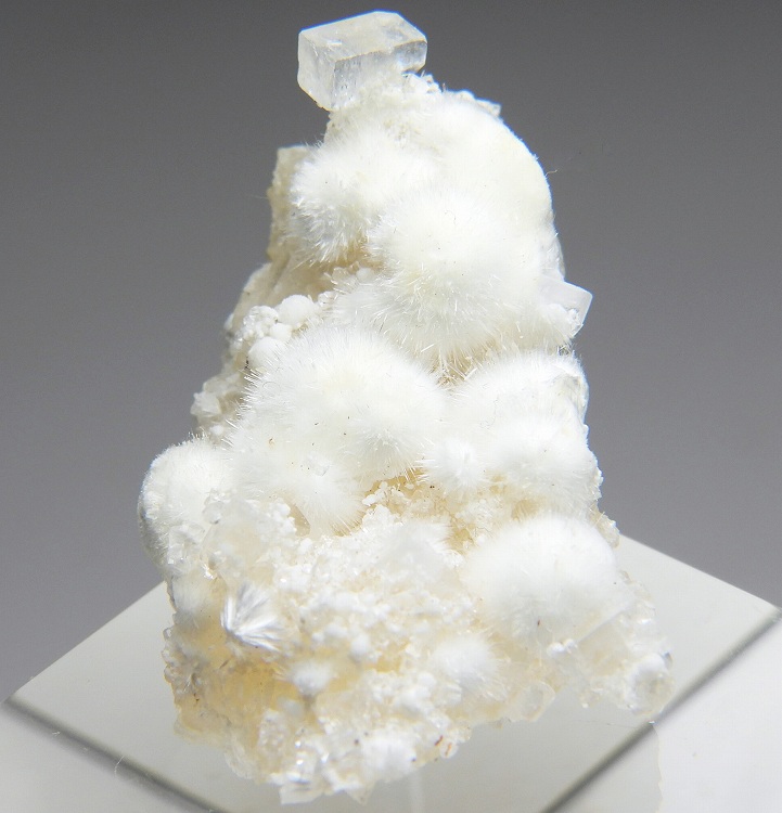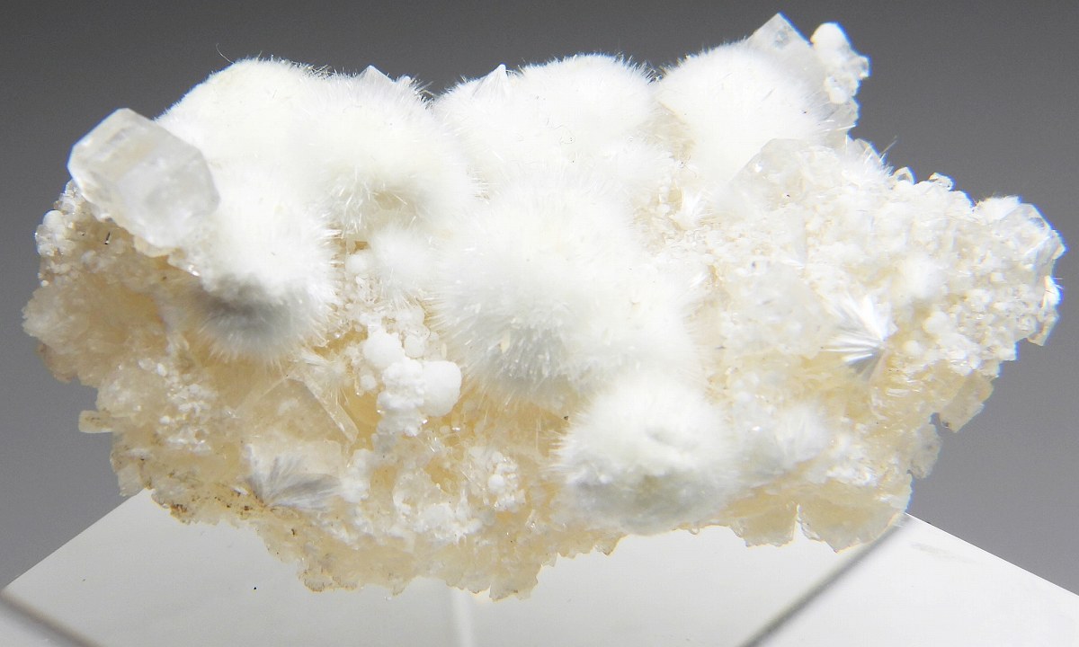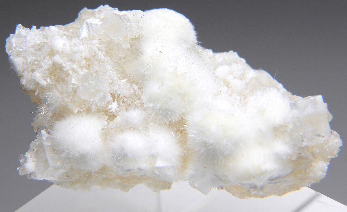 ぶどう石上に成長したオーケン石の結晶群。魚眼石とギロル石が共生します。
