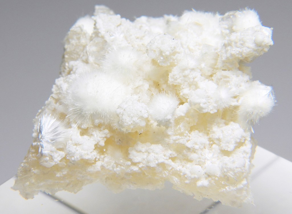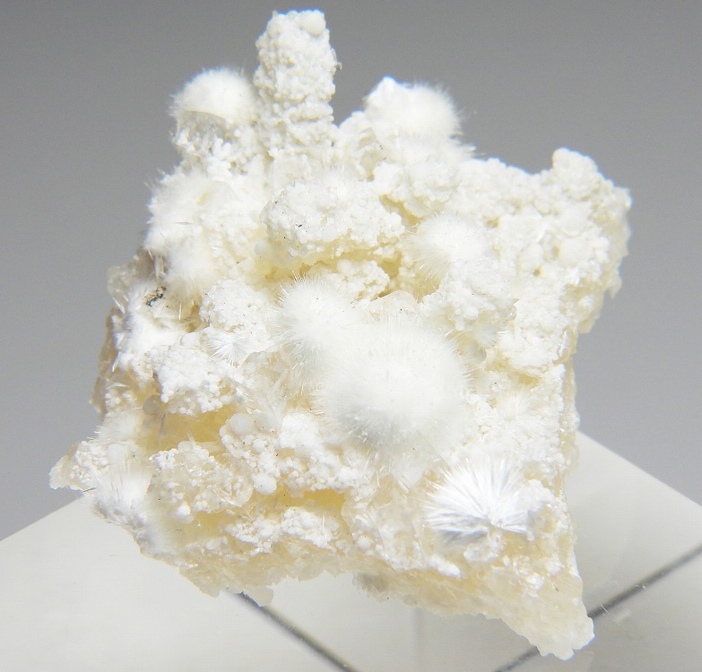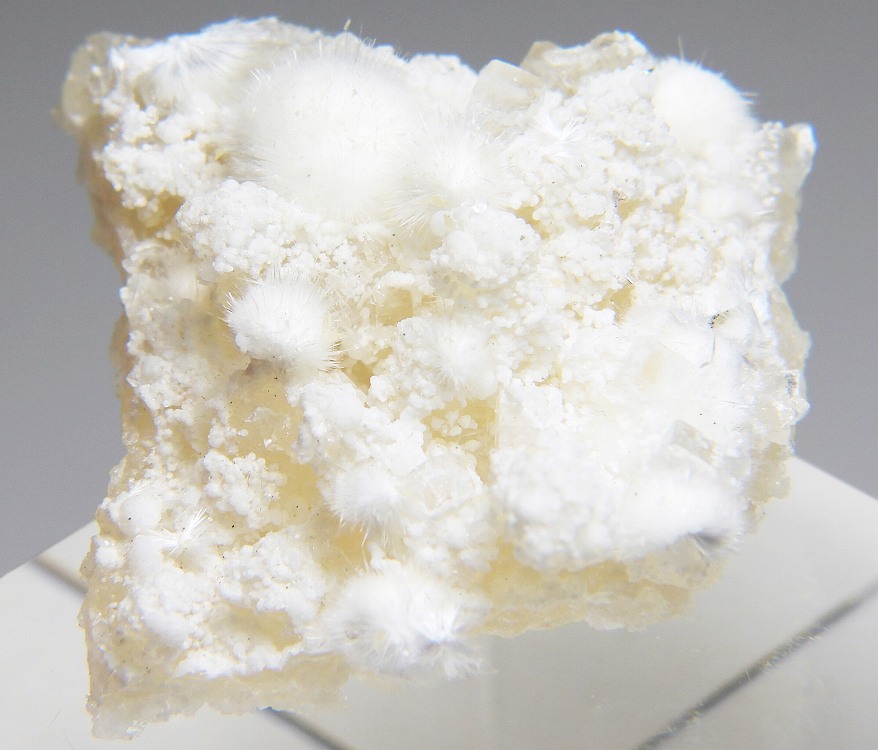 ぶどう石上に成長したオーケン石の結晶群。魚眼石とギロル石が共生します。