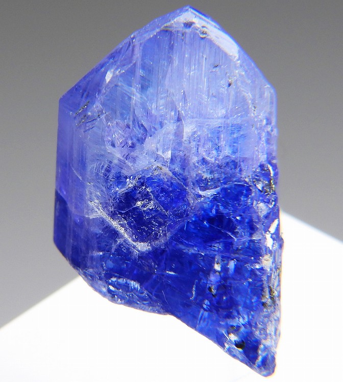 大変美しい多色性が明瞭なタンザナイトの結晶です。通常光源下で撮影。※液晶モニターの前では偏光された光源の影響で写真よりさらに多色性が極端に強調されて見えます。