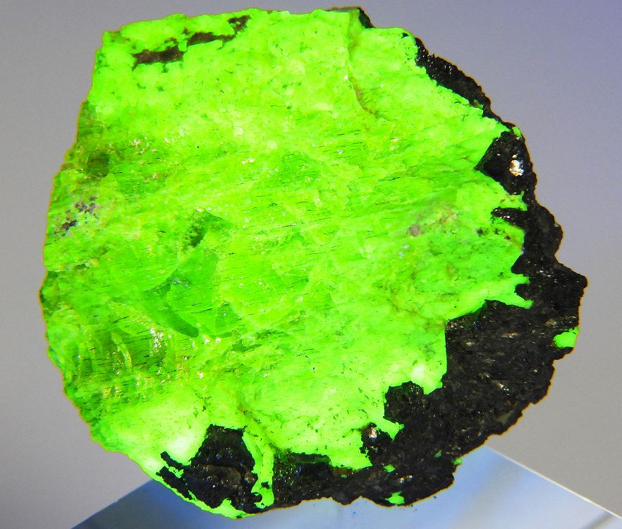 希少なライトグリーンの珪亜鉛鉱。フランクリン鉄鉱や紅亜鉛鉱を伴います。紫外線長波/短波のどちらでも蛍光を発します。
