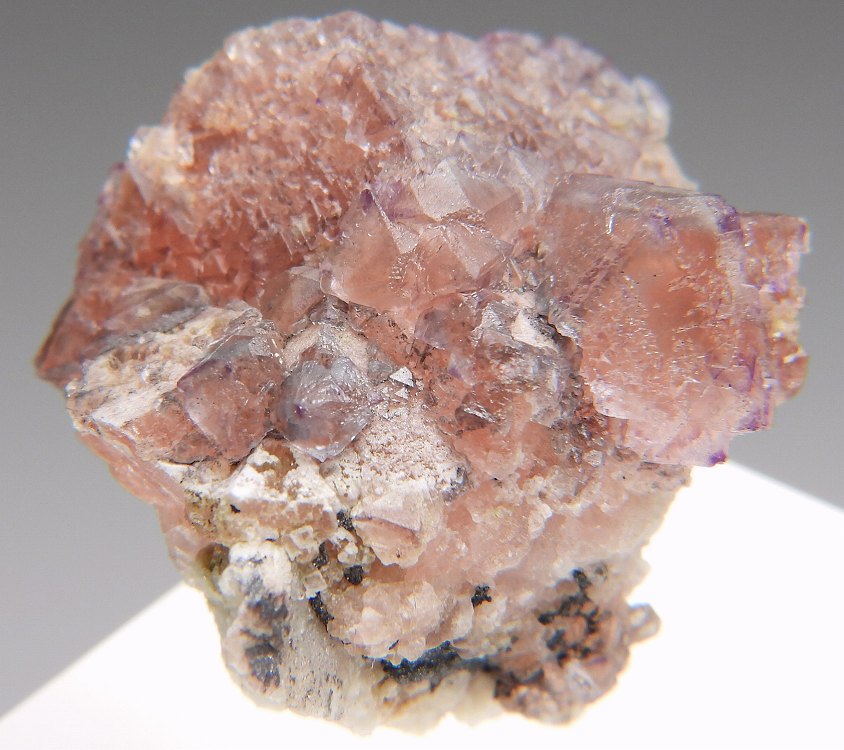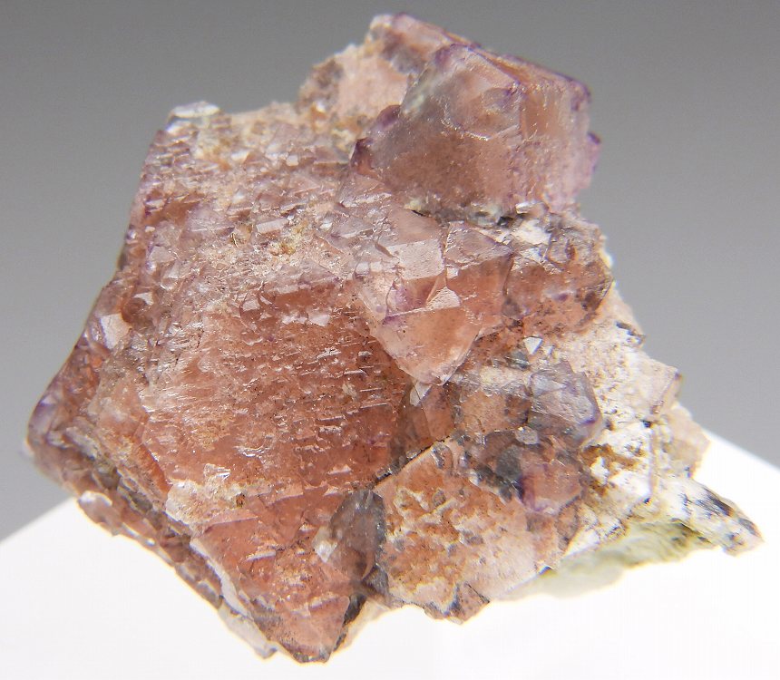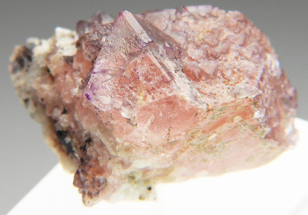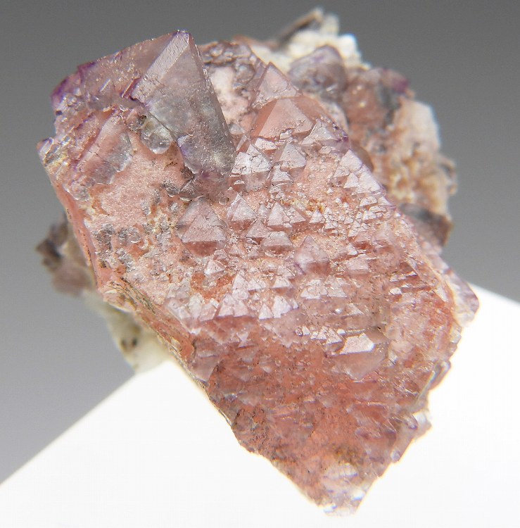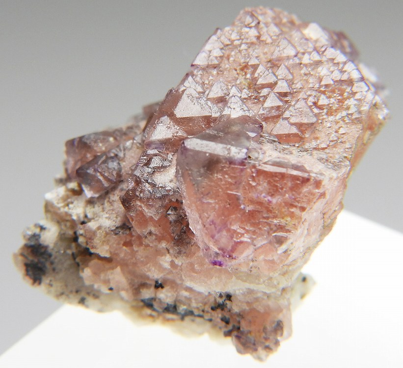 チェリーピンクの端正な八面体結晶群。この産地独特のパープルが入っております。