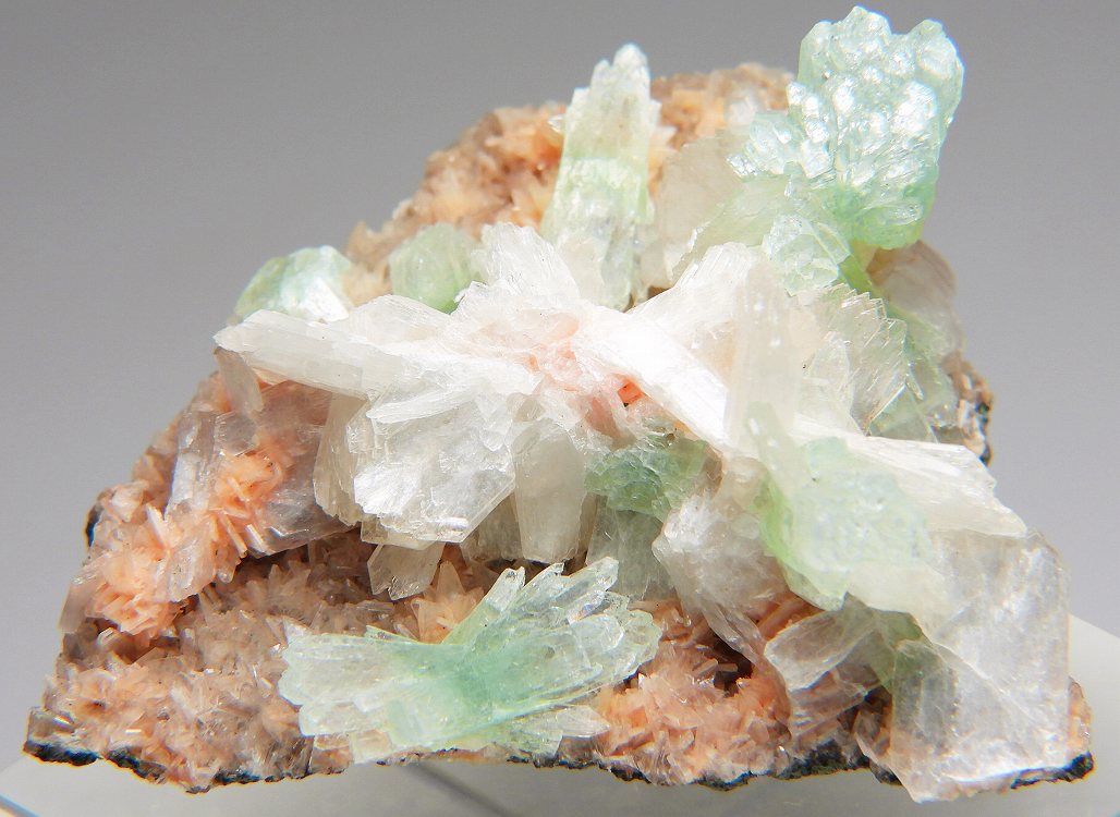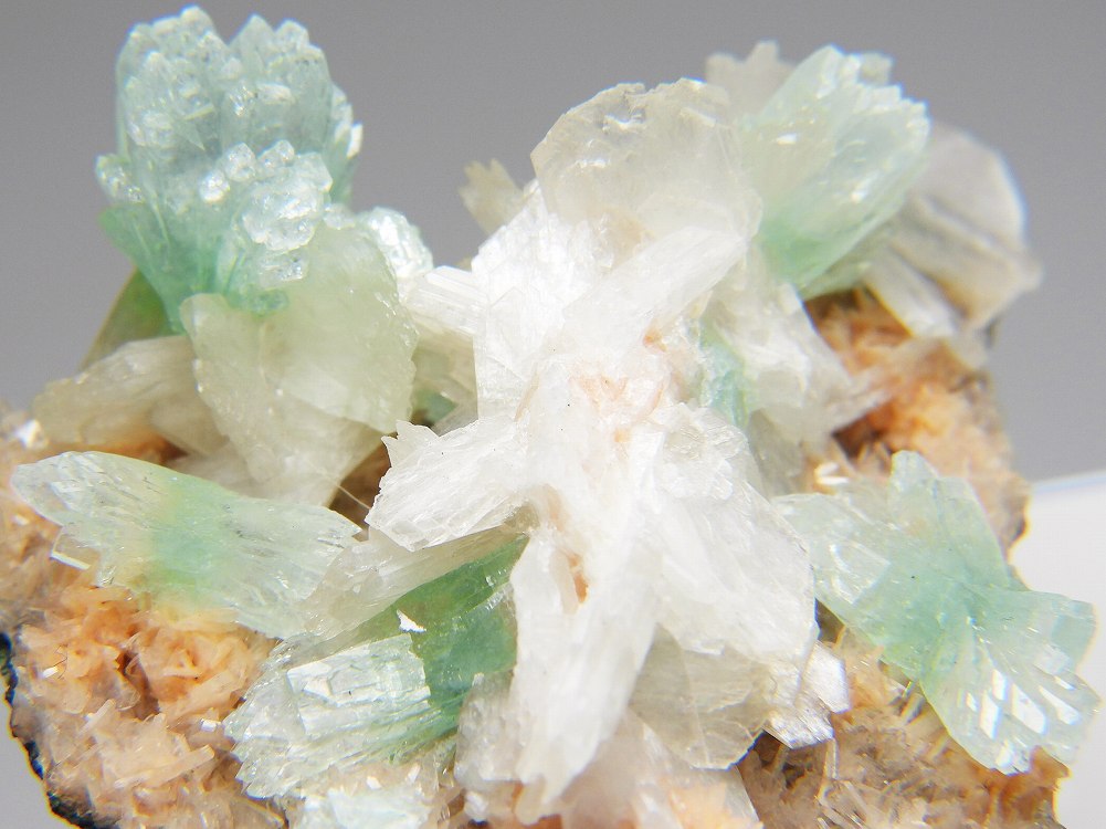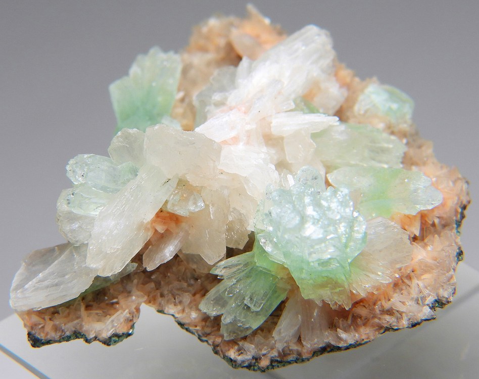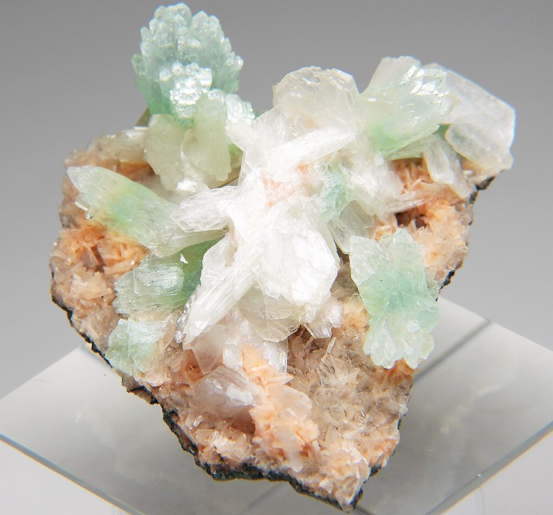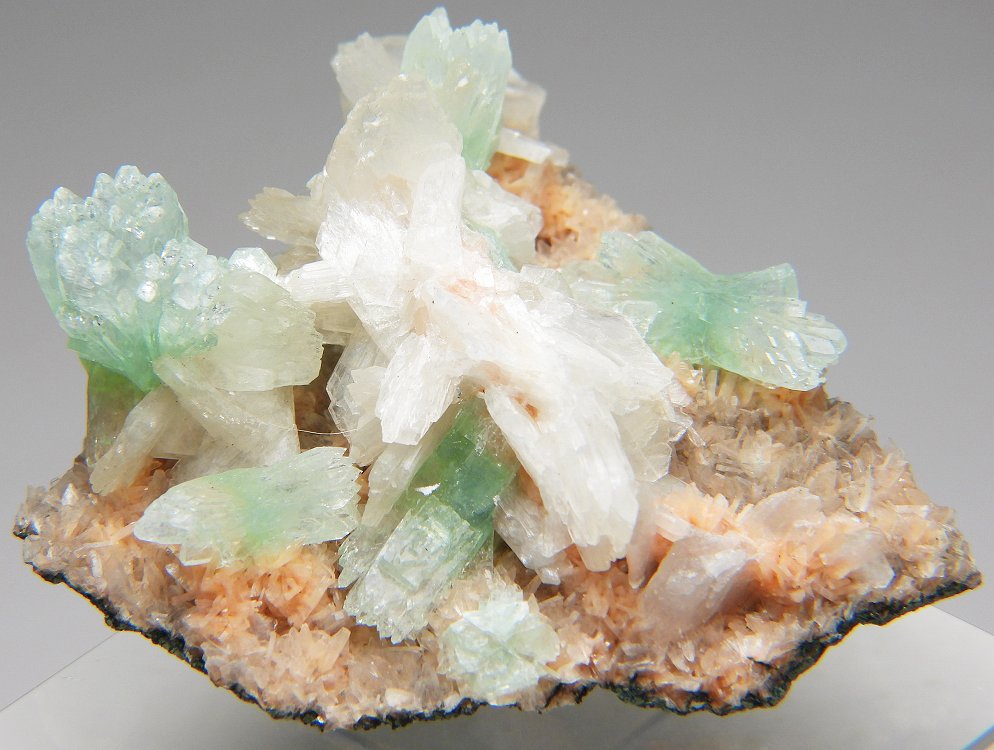 輝沸石と束沸石に共生した放射状の美しいグリーン魚眼石の結晶群です。