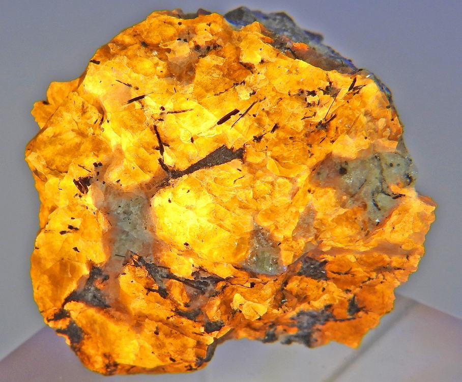 強い蛍光性の方ソーダ石で紫外線長波で非常に明るいオレンジ色の蛍光を発します。短波紫外線照射でハックマン石と同様のテネブレッセンスが見られます。(原産地標本)