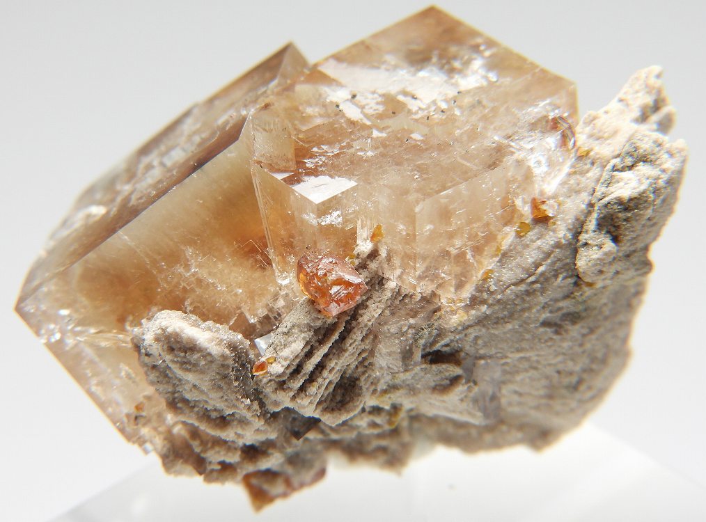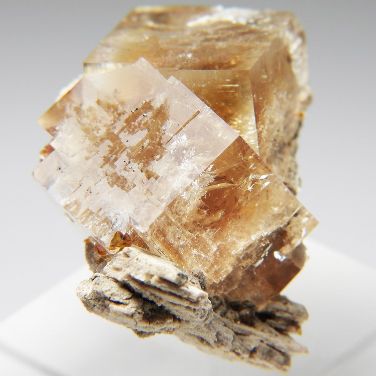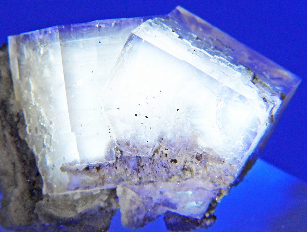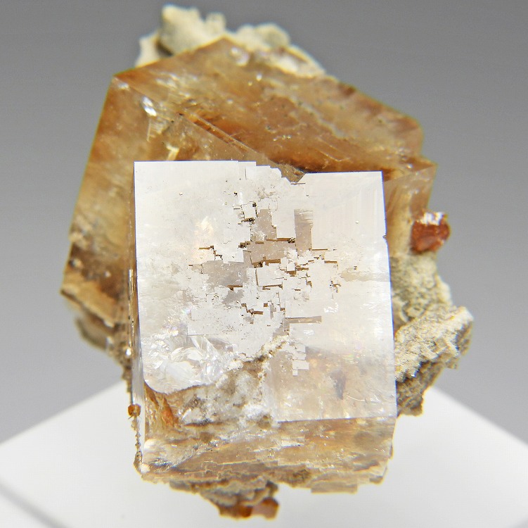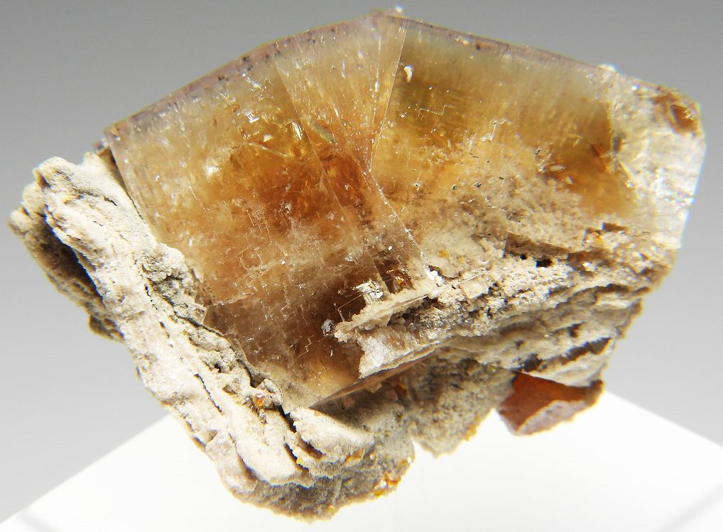 アンバーイエローの美しいフローライト。紫外線長波で明るい白色系の蛍光を発します。