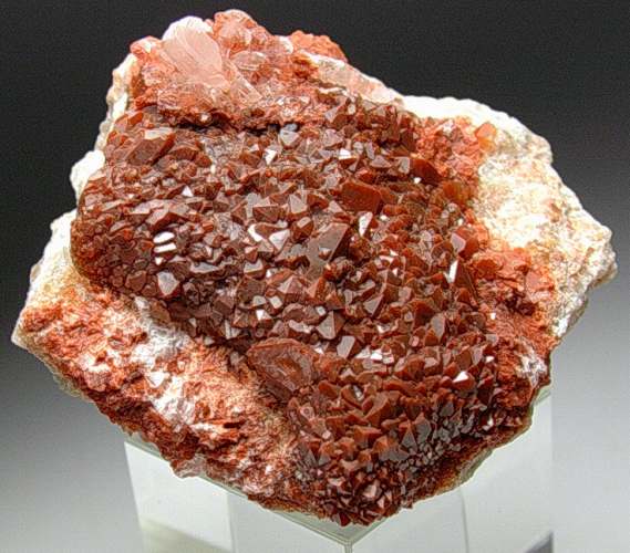 バレンシア地方特産のレッドジプサム上に見られる毬栗状成長した赤水晶です。