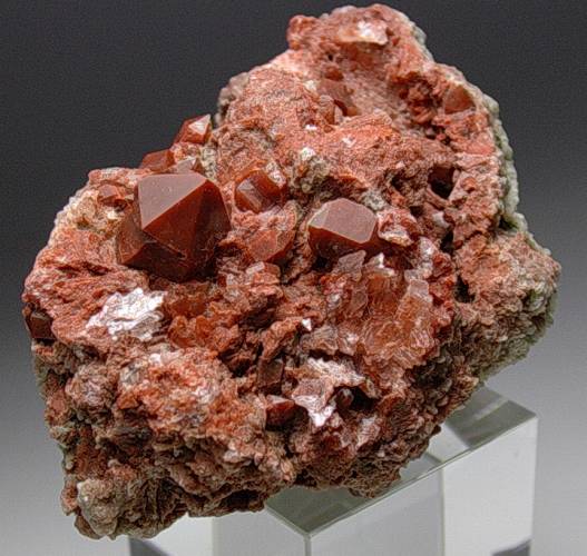 バレンシア地方特産のレッドジプサム上に見られるDT成長した赤水晶です。