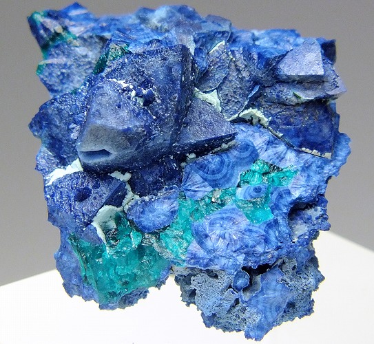 翠銅鉱を置換したシャッタカイトの結晶群。カルサイト→翠銅鉱→シャッタカイトの順で置換されたとされます。大変美しい標本です。