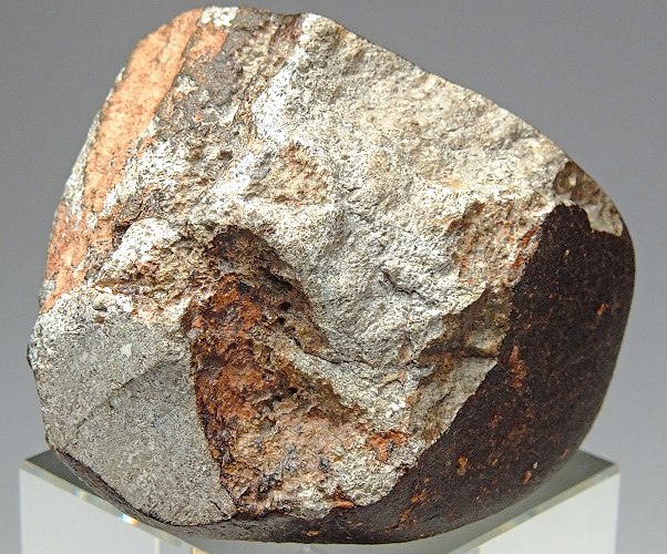 Eucrite-polymictに分類されるエイコンドライト石質隕石。内部は斜長石の白色と黒色の輝石部分が混在しています。ユークライトの母天体は小惑星ベスタであると推定されています。回収量はわずか3.8㎏の希少隕石。フュージョンクラストに覆われた美品。