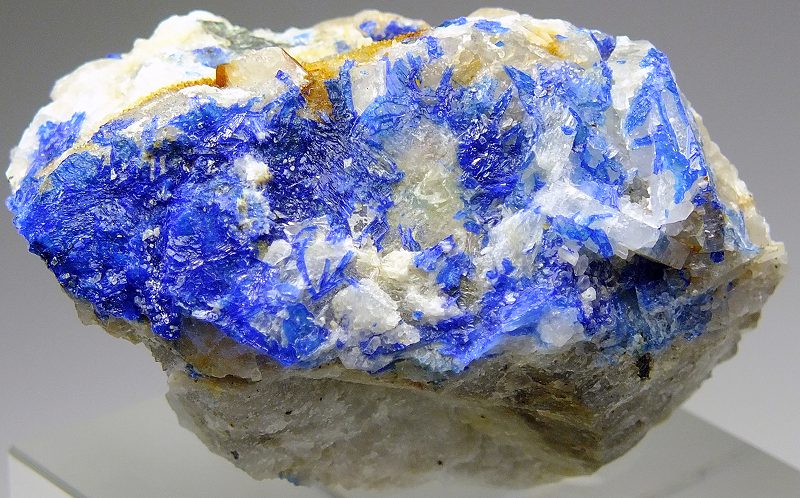フローライト上や空隙に成長した青鉛鉱の結晶群です。