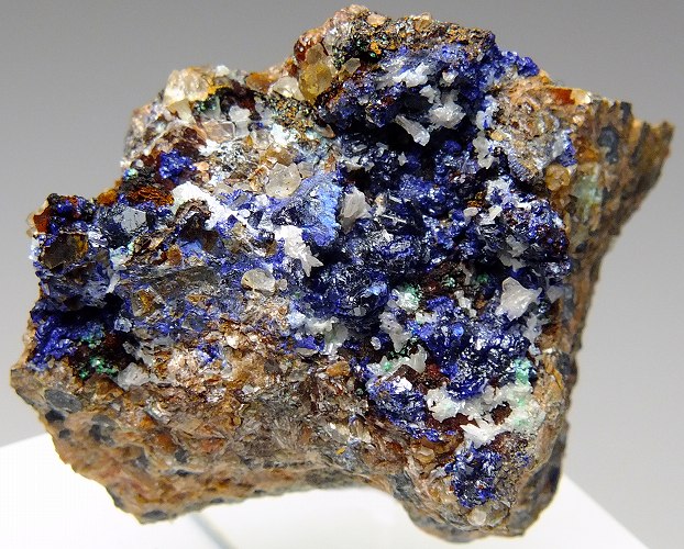 艶やかな藍銅鉱の結晶群に白鉛鉱が共生した標本です。
