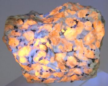 透明感のある美しい方ソーダ石の結晶群。紫外線長波で蛍光を発します。