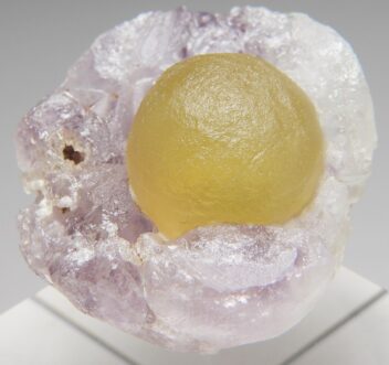 透明度の高いライトイエローの結晶群。天青石とカルサイトが共生します。紫外線長波で蛍光します。