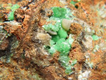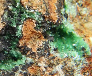 ニッケル華(Annabergite)は、化学組成 Ni₃(AsO₄)₂·8H₂O を持つニッケルのヒ酸塩鉱物で、ニッケル鉱床の酸化帯に二次鉱物として産出します。鮮やかな緑色〜アップルグリーンの色調が特徴で、細かな針状結晶が放射状に集合したり、粉末状・皮殻状に母岩表面を覆う産状がよく見られます。ニッケルを含む硫化鉱物やヒ素鉱物の風化に伴って形成されることが多く、その鮮烈な発色から鉱物標本として高い人気を持つ鉱物です。